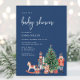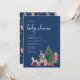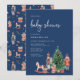 Invitación de Baby Shower azul de vacaciones. Celebra tu ducha de bebé con estilo usando esta impresionante invitación de la colección de invitaciones Baby Shower de la fiesta de los Navidades Nutcracker. Mostrando petardos acuarelas pintadas a mano, juguetes navideños y un árbol navideño festivo, esta invitación presenta texto blanco sobre un fondo azul marino con un patrón coincidente en la parte posterior. Es la elección perfecta para crear una celebración inolvidable. Pida hoy mismo y sumerja a sus huéspedes con una elegancia festiva.