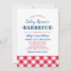 Una moderna y rústica ducha de bebé invita a un evento casual de barbacoa en el patio trasero con colores patrióticos rojo, blanco, azul y marino con un borde estampado de manteles de gingham. Los colores neutros de género funcionan para un niño o chica.