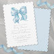 Una hermosa y clásica ducha de bebé con un toque azul adorable con una adorable proa de color azul cielo. Una simple y minimalista ducha clásica para bebés. Texto gris en una mezcla de tipografía de tipo de letra y guión de serif. ¡Celebra que la madre tenga estilo! Puedes cambiar los colores de las fuentes a lo que quieras. También puede cambiar el color de fondo en la parte delantera y trasera. Simple Invitación de Baby Shower Blue Bow Boy. Disponible en forma de invitación impresa, o como una invitación digital descargable que puede enviar por correo electrónico o que ha impreso localmente.