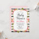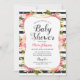 El diseño de la invitación de Baby Shower incluye un suave texto en negro y rosa brillante que puede ser totalmente personalizado para el evento especial, enmarcado por una disposición floral de color bonito con follaje verde y dahlia de primavera y flores rosa rosa pastel, de color rosa y melocotón. Un patrón de tiras de tiza negra suave acentúa el diseño. El diseño de dos caras incluye una foto de maternidad o ultrasonido con el género del bebé (u otro texto) y almacena información del registro en la parte posterior con un color de fondo rosa claro.