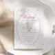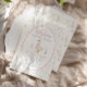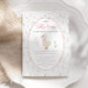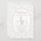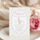 Decorada con una oca de dapper en un arco rosa y un borde de flores silvestres acuáticas, esta invitación es perfecta para una ducha de bebé rústica de estilo vintage. Dulce y femenina con un toque campestre de brillo, ¡justo para tu pequeña gallina en el camino!