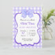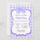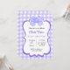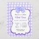 Esta invitación a la ducha para bebés tiene un fondo de gingham morado y blanco con un gran arco de color morado en la parte superior. La zona central está enmarcada con un borde violeta de vieira, perfecto para añadir texto personalizado. El diseño es a la vez encantador y elegante, ideal para celebrar a una niña.
