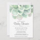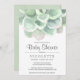 Una invitación a la ducha de bebé botánica con una gran acuarela verde sabio pastel suculenta en la parte superior y tus detalles en un suave tipo de letra gris. En la parte trasera hay un lavabo de acuarela verde. El gran suculento de la parte superior da a un diseño sencillo y tiene un gran elemento natural. Estas invitaciones neutrales en género funcionan bien para un niño o chica duchón de bebé con temática de desierto en primavera o verano.