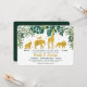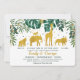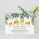 Invitación caprichosa a la ducha de bebé con un grupo de bonitos animales de safari en un Relieve metalizado de oro falso y hermosas hojas tropicales © Blue Bunny Studio