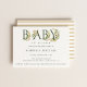 BABY In Bloom, flores acuáticas y delicada vegetación adornaron letras en negrita, invitación a la ducha de bebé. La parte posterior de la tarjeta incluye un patrón de banda de color neutro.
