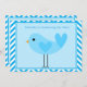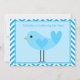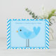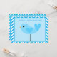 Pájaro azul moderno con cola azul en un fondo de chevron azul. La invitación perfecta para que mamá sea un niño.