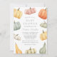 Celebra tu pequeña con esta invitación a una ducha de bebé de otoño, neutra desde el punto de vista del género, que incluye calabazas acuáticas en suaves tonalidades de otoño de naranja, amarillo, sabio, crema y rubor. Los detalles de la ducha se muestran en una combinación de elegantes tipos de letra de guión manuscrito y serif en un fondo blanco. Este moderno y acogedor diseño es perfecto para las duchas de otoño que celebran a un bebé o chica.