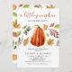 Invitaciones rústicas para una ducha de bebé de otoño con un fondo blanco simple, hojas de una hermosa acuarela, una calabaza y una moderna plantilla para una ducha de bebé que es fácil de personalizar.