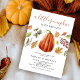 Invitaciones rústicas de baby shower de otoño con un fondo blanco simple, hermosas hojas de otoño pintadas a la acuarela, una calabaza, y una plantilla moderna de baby shower que es fácil de personalizar.