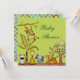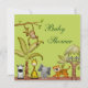 Diseño de una ducha de bebé en color verde, totalmente neutro en la jungla. Con una cebra, jirafa, león, tigre, hipopótamo, rinoceronte, avestruz, elefante y mono colgando del árbol. Las palmeras de la jungla le dan un toque de jungla salvaje.