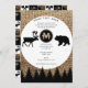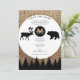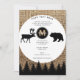 Un bonito diseño temático de lumberjack camping. La textura de las argollas se ve en el fondo con ciervo, oso y bosque en primer plano. Una invitación perfecta para una ducha de bebé. Personalizar el texto y hazlo propio. La decoración de la ducha de bebé y los favores disponibles en esta colección.