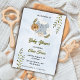 Esta invitación a la ducha para bebés tiene un suave fondo de color azul con delicadas hojas verdes adornando las esquinas. En la parte superior hay un traje de bebé vintage, que incluye un vestido, una servilleta, zapatos y medias, lo que le da un ambiente clásico y atemporal perfecto para celebrar la llegada de una parrillada.