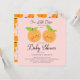 Hay dos pequeñas corbatas en el camino para la ducha de bebé con adorables naranjas de clementina colocados sobre un fondo rosa claro. Voltea nuestra invitación para ver una coordinación hacia atrás con naranjas colocados en un fondo rosado. Visita nuestra tienda para ver nuestra adorable colección de diseño.