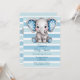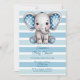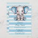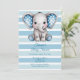 Celebra la llegada de un bebé con este dulce ilustracion acuático de un elefante bebé con orejas de punto de polka azul, mejillas rosadas y flores juguetonas en un fondo azul y blanco rayado. Perfecto para invitaciones a la ducha de bebé, decoración fiesta o arte en vivero.