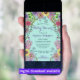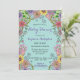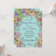 Esta invitación de Baby Shower es una armoniosa combinación de elegancia y vitalidad, con la intención de invitar cordialmente a los invitados a celebrar la próxima llegada. El fondo es un verde azulado suave, lo que crea un ambiente sereno para el vibrante borde florido que rodea los bordes. Una variedad de flores en tonos radiantes de morado, rosa, amarillo y verde entrelazado elegantemente, exudando una sensación de vida floreciente y alegre anticipación. El texto en el centro es claramente legible en el contexto verde azulado sereno que crea un efecto tranquilizador. En general, esta invitación captura la alegría y la anticipación de una ducha de bebé con sus colores vivos y su diseño elegante. Es una fantástica combinación de estilo y función, que ofrece todos los detalles necesarios y a la vez genera una invitación visualmente hermosa.