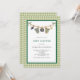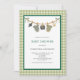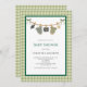 Invitación a la ducha de bebé de Halloween con ropa neutra de género. Es fácil cambiar el texto. Cuidada acuarela de halloween y ropa de bahía. Fondo de gingham verde. Un diseño divertido para una ducha de bebé.