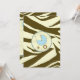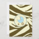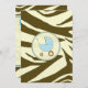 Invitación con fondo de estampado de cebra marrón sobre beige cálido con guarnecido azul claro. Personalice el texto de las fuentes marrón y azul con los detalles de su evento. En el lado opuesto hay una huella de cebra sólida con un carro azul en el interior de un marco en forma de círculo.