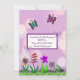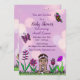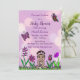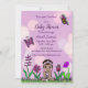 Niña dibujada a mano, púrpura, mariposas, flores y arcos invitaciones a Baby Shower. Este pequeño bebé étnico puede representar a una niña afroamericana.