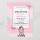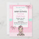 Niña dibujada a mano, rosa y verde azulada, la polka da y trae invitaciones a Baby Shower.