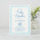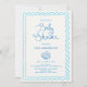 Celebra el estilo con nuestra fantástica invitación a la ducha de bebé con temática playera. Esta invitación presenta un hermoso caparazón dibujado a mano en un estilo divertido y lúdico con un marco azul celeste que lo rodea, acompañado por un original tipo de letra estrafalaria que capta perfectamente la emoción y la alegría de la ocasión.