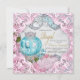 Invitación de baby shower de princesa real para niñas con lujoso rosa y azul teal con hermoso carruaje real y preciosa rosa rosa y azul teal y fondo de brillo plateado con elegantes remolinos rosados. Esta elegante invitación de baby shower de princesa se personaliza fácilmente para su evento simplemente agregando sus datos en el estilo de letra y color, y redacción de su elección. Este es un diseño impreso sin joyas reales, cintas, brillo, etc.