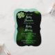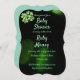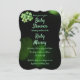 Fondo bokeh verde y negro con algunos tréboles de acuarela en la esquina superior izquierda para buena suerte. El texto es blanco con contorno verde y sombra verde claro como invitación totalmente personalizable a una fiesta de bebé para una futura mamá.