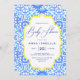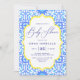 ¡Celebra la llegada de tu pequeño con esta invitación Baby Shower de inspiración italiana azul en mosaico amarillo! Con delicados motivos de cerámica azul de inspiración mediterránea, elegantes marcos amarillos y letras de guión para "Baby Shower", este diseño combina la elegancia italiana atemporal con el encanto minimalista. Personalizable completo con el nombre, fecha, hora, lugar y detalles del honorario, esta invitación es perfecta para los padres que adoran la sofisticación europea. La nítida paleta azul y blanco y la fuente de escritura clásica crean un diseño versátil y neutro en género ideal para celebraciones modernas o tradicionales. Personaliza sin esfuerzo por una invitación digna de ser conservada que capta la calidez de la dolce vita.