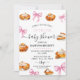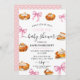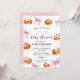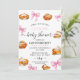 Esta encantadora invitación capta la combinación perfecta de calor otoñal y dulzura femenina. Hermosos ilustraciones acuarelas de tartas de calabaza se sientan junto a cintas y arcos rosados satinizados, todo ello sobre una suave paleta de colores de rosa rubor, cremas y neutrales cálidos. El diseño es ideal para dar la bienvenida a una niñita, evocando una sensación de hogar, cosecha y celebración sentida.