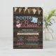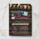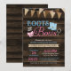 Invitaciones de fiesta de revelación de género con botas y lazos rústicos. Una invitación única de revelación de género con tema campestre, que incluye una bandera de tela de saco, un lazo rosa y un par de botas de vaquero azules sobre un fondo de madera de granero.