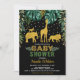 Extraordinaria invitación a una ducha de bebé con temática de la jungla con un grupo de bonitos animales de safari en falso oro y bellas hojas tropicales© Blue Bunny Studio