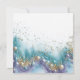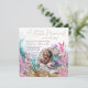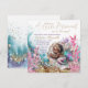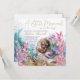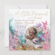 Invitación de baby shower de sirena afroamericana con adorable bebé sirena durmiendo en una hermosa concha de clam rodeada de perlas, arena, coral y plantas submarinas.