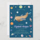 Invitación a la ducha de bebé en el espacio exterior en una ducha de bebé azul. Estas invitaciones a la ducha de bebé se personalizan fácilmente para tu evento simplemente añadiendo tus detalles.
