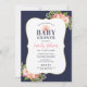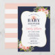 Esta elegante invitación para baby shower presenta un texto serif en negrita "Baby Shower" dentro de un marco de corchetes dorados sobre un fondo azul marino intenso, acentuado por arreglos de esquina de acuarela exuberantes de flores de dahlia y rosa en tonos rosa pálido, melocotón y coral con follaje verde fresco. La caligrafía en rosa destaca el nombre de la homenajeada para un toque femenino y refinado. Un patrón de franjas anchas de color azul marino y blanco adorna la parte posterior de la tarjeta. Todo el texto es totalmente personalizable para su celebración.