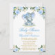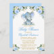Elefante de Bebé Blue Floral Blue Floral con invitación a Baby Shower Blue Bow. Incluye hermosos rosas azul acuático, flores blancas y vegetación botánica. Texto dorado y azul.