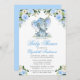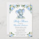 Elefante de Bebé Blue Floral Blue Floral con invitación a Baby Shower Blue Bow. Incluye hermosos rosas azul acuático, flores blancas y vegetación botánica. Texto plateado y azul.