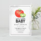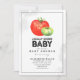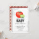 El mercado rústico de granjeros inspiró un tema de ducha de bebé neutro de género con un tomate rojo y verde sobre fondo blanco con texto negro. En frente hay gingham roja y blanca.