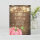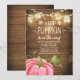 (H) ¡Una linda y divertida ducha de bebé invita a una calabaza en el camino! Fondo rústico de madera con luces de cuerda y calabaza rosa para una ducha de bebé Chica.