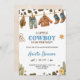 Baby shower invitation with a cowboy theme. Features cartoon cowboy hat, boots, and denim clothes on a clothesline, with text "A Little Cowboy is on the Way!" Decorative cacti and flowers frame the bottom, providing a playful and rustic feel.