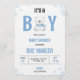 Baby shower invitation with a cute bear and snowflakes design. Text announces "It's a Boy" with event details for honoring Sue Vaneer on January 28 at 6 PM in Austin, Texas.