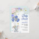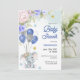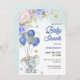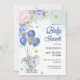 Baby shower invitation card with a watercolor design featuring a cute elephant holding blue balloons, surrounded by pastel flowers and stars. Invitation details are printed in blue script. The back of the card is plain.