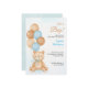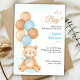 Baby shower invitation with a cute teddy bear holding blue and brown balloons. "It's a Boy!". Light blue and beige tones create a joyful ambiance.