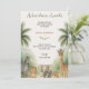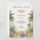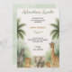 Baby shower invitation with the text 'Adventure Awaits' and jungle animals like a zebra, lion, elephant, and giraffe against palm leaves. Neutral tone."