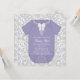 Adorable traje de cuerpo infantil púrpura lavanda con collar de diamantes e invitaciones a la ducha de niña de color púrpura y gris con arco blanco. Esta invitación a ducha de bebé de damasco gris y púrpura es fácil de personalizar para tu evento añadiendo detalles del evento, estilo de fuente, tamaño y color del tipo de letra, y texto.