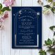 Mystical Blue Silver Sun Moon Stars Baby Shower Celestial Gender Reveal Baby Shower Invitation incluye un sol plateado, luna y estrellas enmarcadas en un fondo azul con los detalles de su menú en el centro en un guión moderno de caligrafía plateada. Dentro está su ducha de bebé personalizado y el sexo revelan información sobre la invitación. Personalice editando el texto en los cuadros de texto. Diseñado para usted por ©2022 Evco Studio www.zazzle.com/store/evcostudio