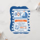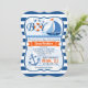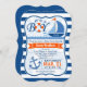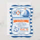 It's a Boy! Náutica, tema de barco de vela niño invitación a ducha de bebé con un patrón de rayas azul marino y blanco. El barco de vela azul oscuro y claro se encuentra en aguas oceánicas onduladas, es un salvavidas naranja y blanco, y es un ancla de barco azul. Los colores son naranja, azul real, blanco y azul cielo. Invitación en forma de soporte de época.
