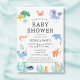 Invitaciones a una ducha de bebé con un tema de animales de mar y un diseño neutro desde el punto de vista del género. Incluye un pez, delfín, camarón, tortuga, ballena, caballito de mar, pez estrella, cangrejo y más.