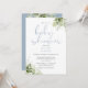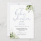 Una elegante y sofisticada invitación para baby shower que presenta tipografía azul polvoriento elegante y hermoso follaje de vegetación botánica. Diseñada por Thisisnotme©