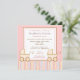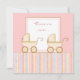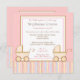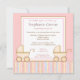 ¡Dos veces más agradable! Esa es la invitación de esta invitación a la ducha de bebé que tiene dos adorables carritos rosas con rayas rosas, azules, amarillas y marrones en un fondo amarillo.