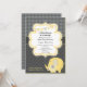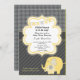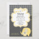 Invitación a la ducha para bebés con elefante amarillo y fondo gris. Perfecto para una ducha neutra de género.