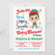 Invitación Baby Shower Feo Sweater. Presenta a un niño pequeño vestido con el suéter de su Navidad, pañal y gorra de elfo. Fuentes coloridas y copos de nieve.